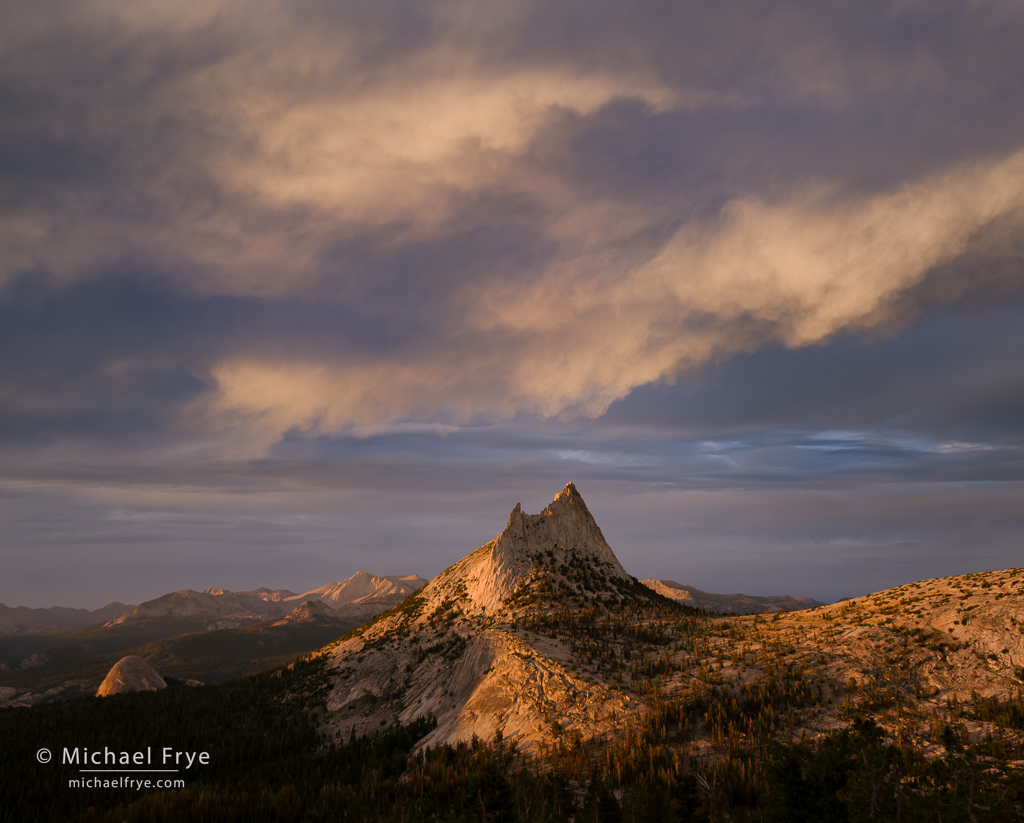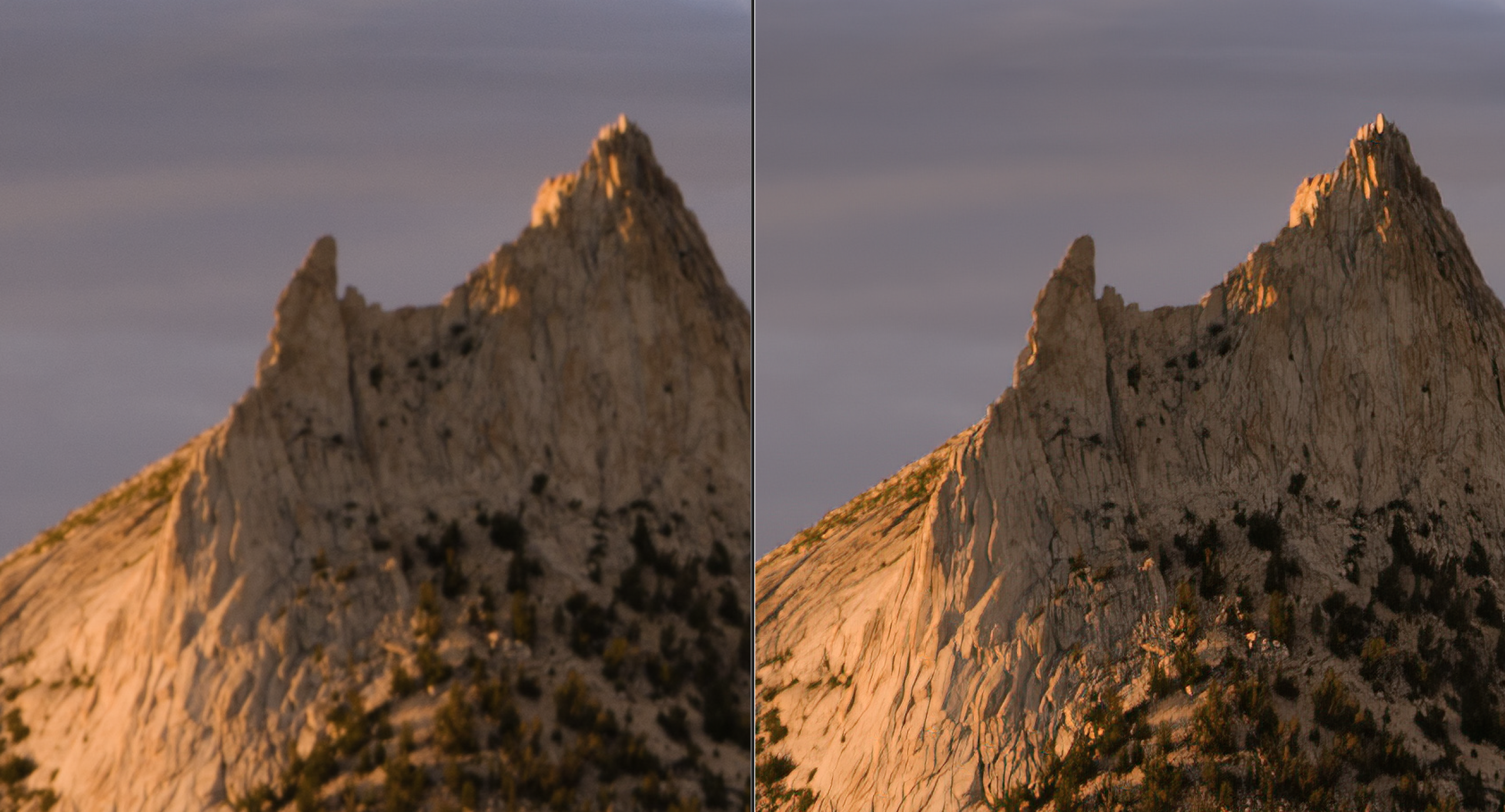Everyone makes mistakes! I somehow missed the focus on this photograph from the Yosemite high country. Fortunately I was able to rescue it and achieve acceptible sharpness using AI-powered tools. The screenshot below shows a 200% view of the prominent peak, with the original, out-of-focus version on the left, and the rescued version on the right.